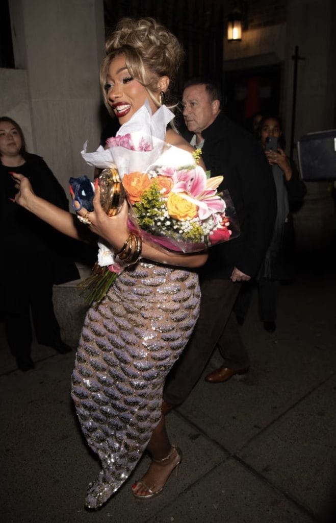 Prömiyer gecesinin ardından New York’taki Al Hirschfeld Theatre önünde görüntülenen Megan, bu kez kutlama için seçtiği iddialı parti elbisesiyle dikkat çekti. Retrofête imzalı şampanya tonlarındaki transparan halter elbise, deniz kabuğu formunda işlenmiş payet detayları ve damla şeklindeki taş süslemeleriyle art deco esintileri taşıyordu. Altın rengi Stuart Weitzman sandaletler, kalın altın bilezikler ve gösterişli küpelerle kombinini tamamlayan sanatçı, sarı saçlarını Eski Hollywood stilini anımsatan kıvırcık bir topuzla topladı.