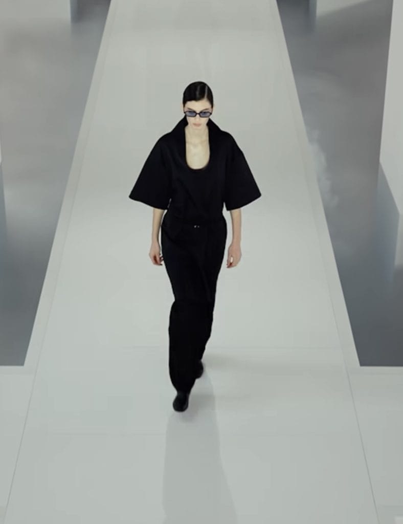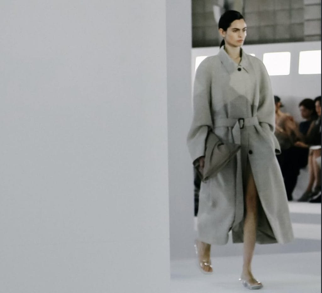 Kadın koleksiyonunda 90’ların arınmış minimalizmi hissedilirken, belirgin omuz hatları 80’lerin güçlü siluetlerine gönderme yaptı. Transparan ribana trikolar elbiselerde ve kombinlerde hafif bir katman etkisi yaratırken, ipek kumaş; plili formlarda, omzu açık heykelsi bir elbisede ve markanın imza gömlek tasarımında öne çıktı.