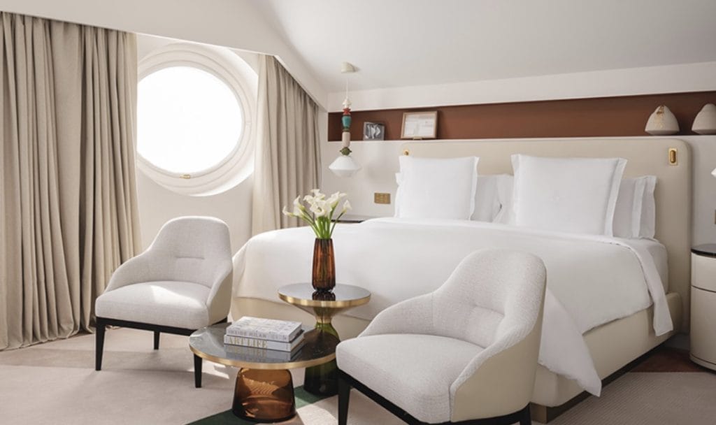 91 metrekarelik Designer Suite ise daha aydınlık ve rafine bir atmosfer sunuyor. Oval pencerelerden süzülen doğal ışık, yatak odası ve yaşam alanını öne çıkarırken ahşap zeminler ve özel tasarım halılar sıcak bir ambiyans yaratıyor. Dekorasyonda orta yüzyıl İtalyan tasarımının izleri hissediliyor; Gio Ponti ve Piero Fornasetti gibi isimlerin estetik anlayışı çağdaş dokunuşlarla harmanlanmış. Carrara mermer banyoda yer alan geniş küvet ve Charlotte Perriand’dan ilham alan kütüphane alanı ise işlevselliği stil ile buluşturuyor.