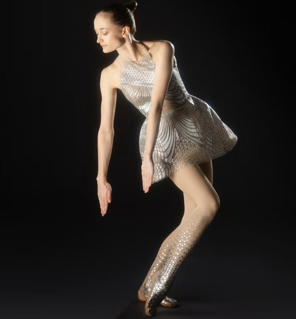 Performans için yeniden yorumladığı “hava kumaşı”, dünyanın en hafif tekstili olarak biliniyor. Lazer kesimle üç boyutlu biçimde işlenen bu malzeme, dansçılarla birlikte akışkan bir hareket yarattı. Van Herpen’e göre bu, yalnızca bir kostüm değil, dansçının iç dünyasının görsel bir yansımasıydı: “Kostüm bedene giydirilmez, onun ruhunu sahneye taşır.”