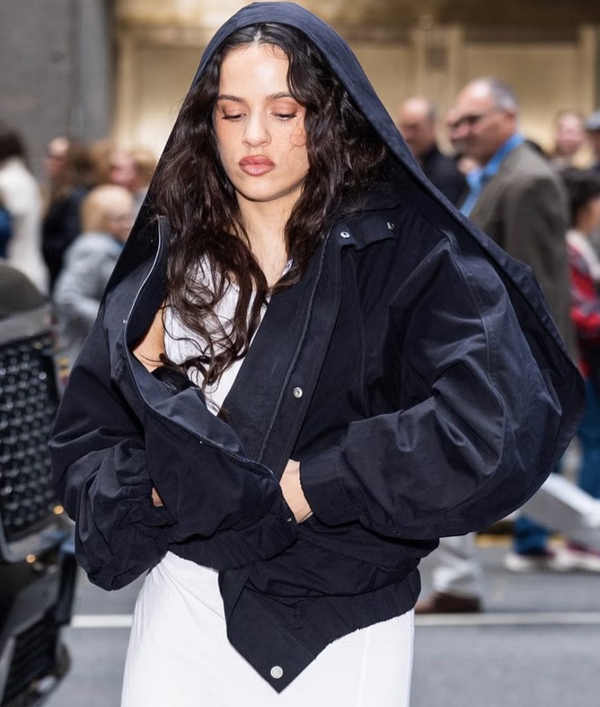 Ceket, arkasına doğru akarak inen geniş kapüşonuyla ince bir şekilde rahibelik başlığını anımsatıyor ve sanatçının “ilahi” stil anlatımına yeni bir katman ekliyordu. Gümüş metal detaylarla süslenen ve oversize kesimiyle öne çıkan model, geçtiğimiz hafta tercih ettiği couture ağırlıklı görünümlere kıyasla daha sokak stili odaklı bir dokunuş taşıyordu. Rosalía ceketi fermuarını kapatmadan, ceplere soktuğu elleriyle ön panelleri hafifçe sardı; bu da görünümüne rahat ama etkileyici bir ifade kattı.